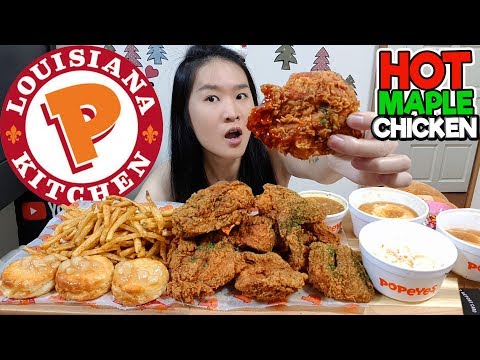 Eating Popeyes Hot Maple Fried Chicken, Apple Glazed Biscuits, Cajun Fries, Coleslaw and Mash Potato...